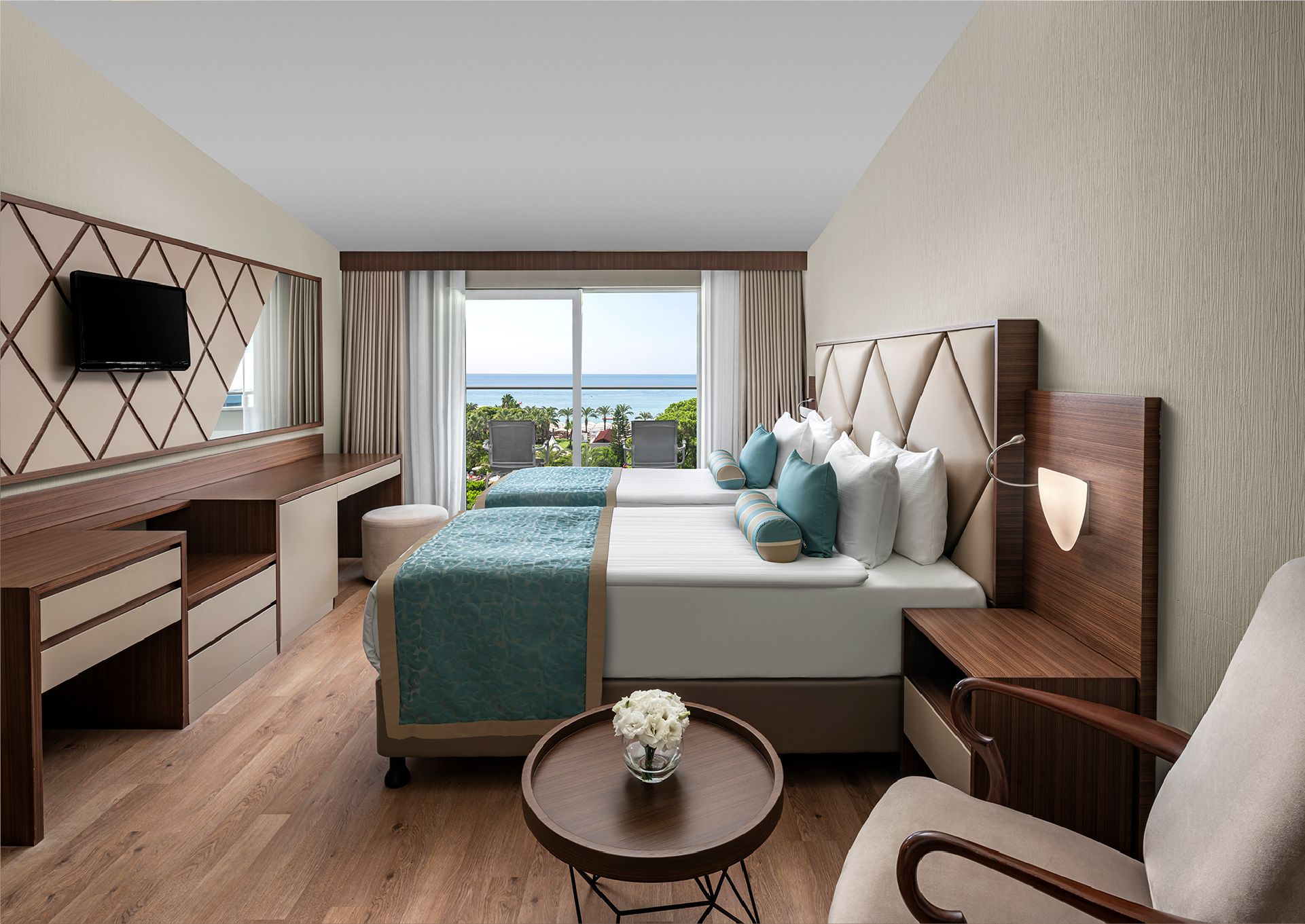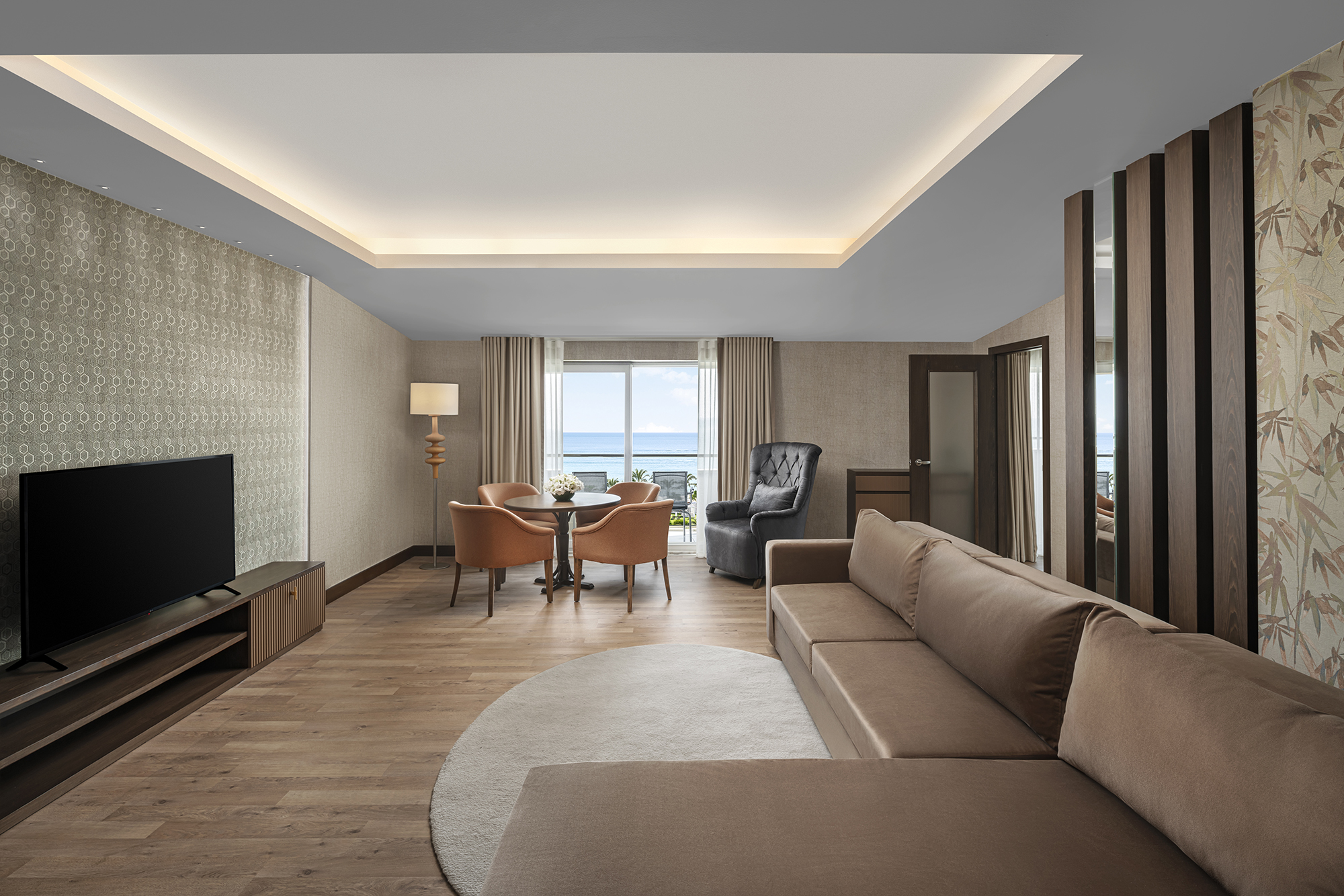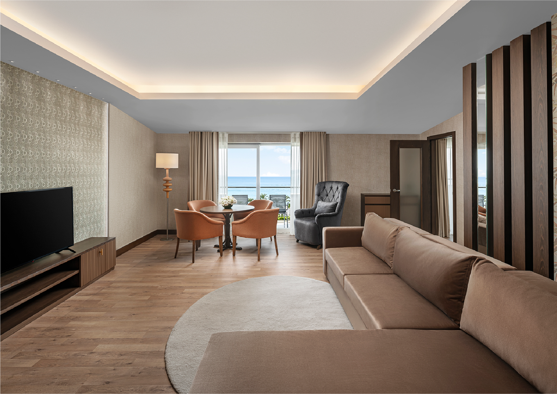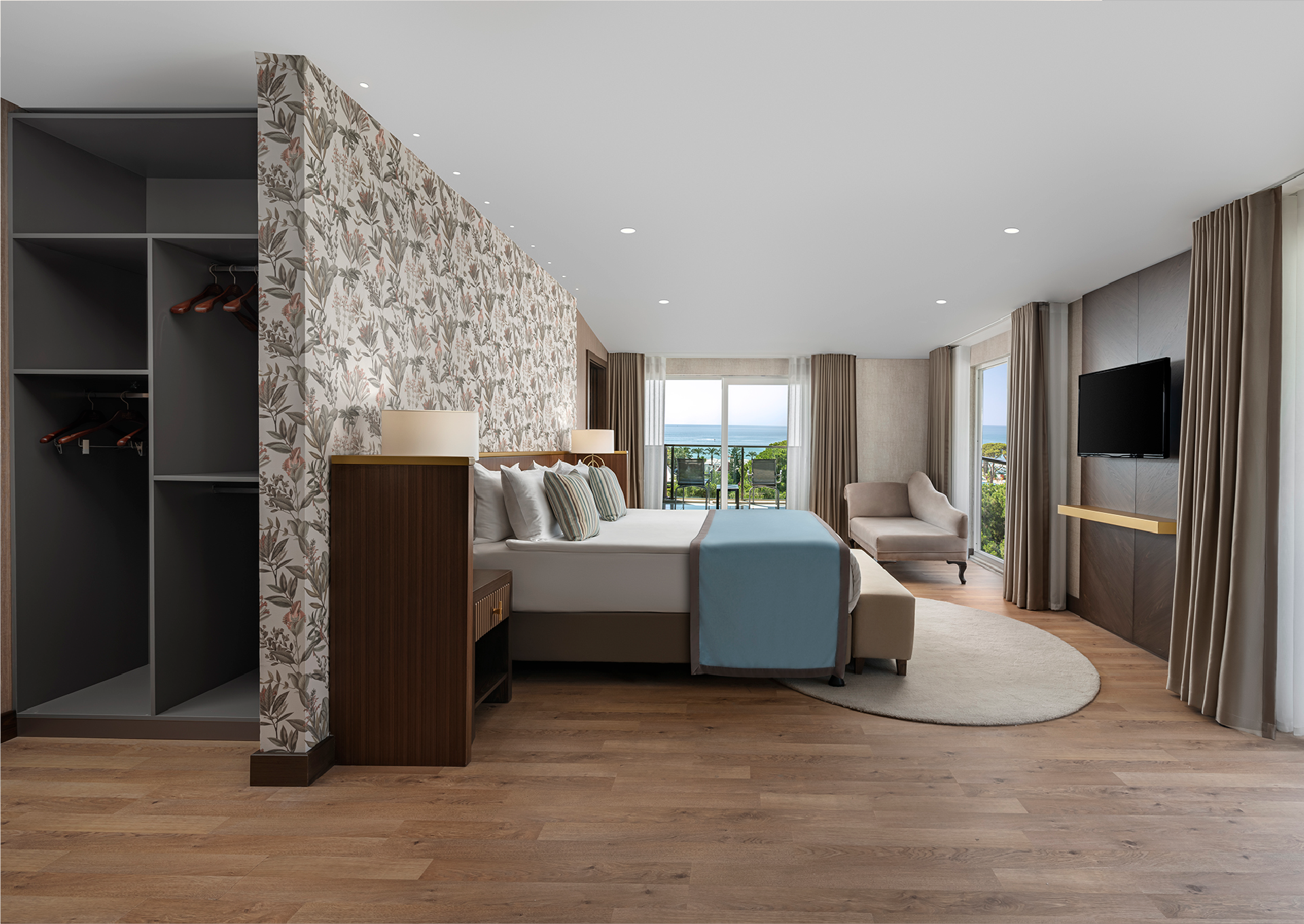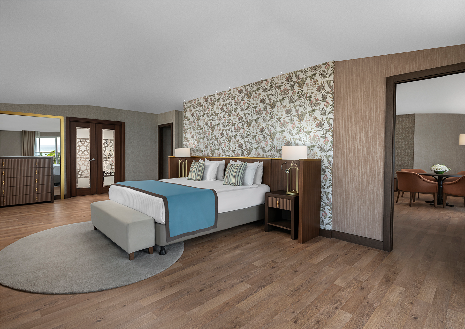128 m²’lik King Suite, iki yatak odası ve geniş salonuyla aile konaklamalarına uyum sağlar. Deniz manzarasıyla çevrili bu alan, ölçülü bir konfor sunar.