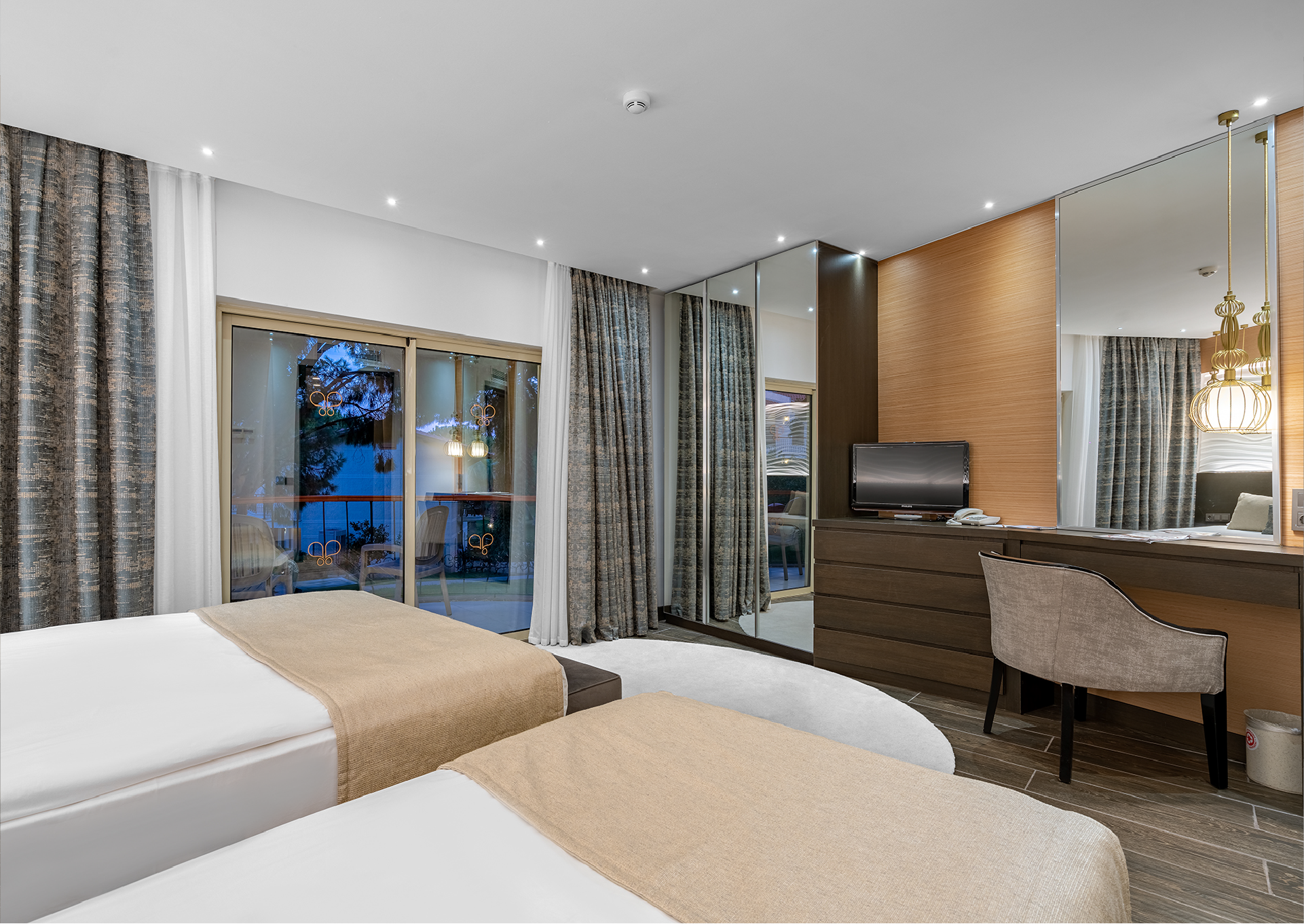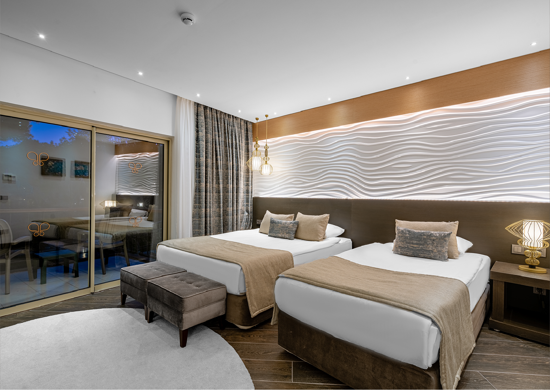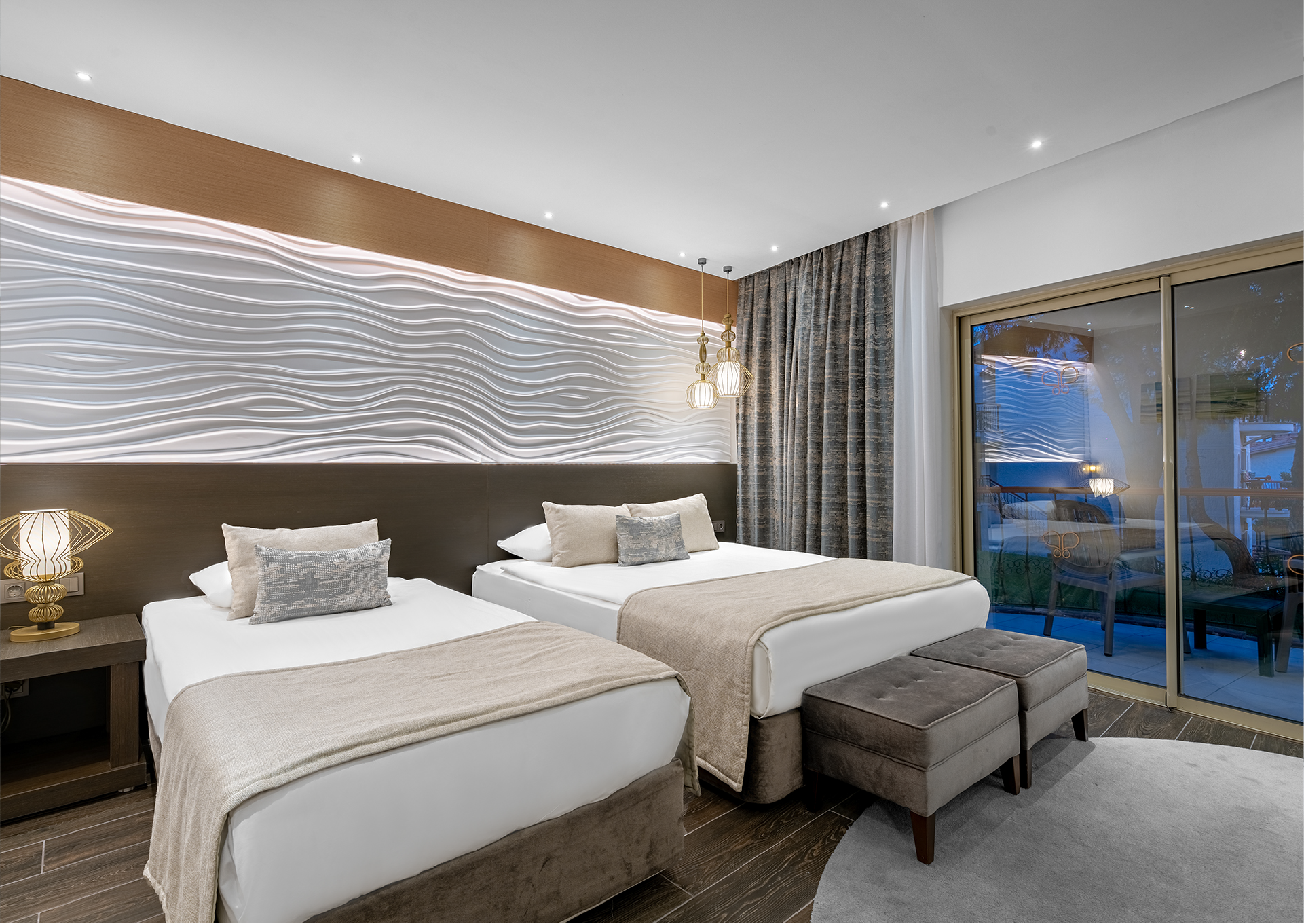 Comfort Club Family Room, geniş aileler için doğayla iç içe, sakin bir tatil kurgusu sunar. 50 m²’lik ferah bir alana yayılan ve iki ayrı yatak odasından oluşan bu yaşam alanı, altı kişiye kadar konaklama kapasitesiyle birliktelik ve mahremiyeti dengeli bir uyum içinde buluşturur.