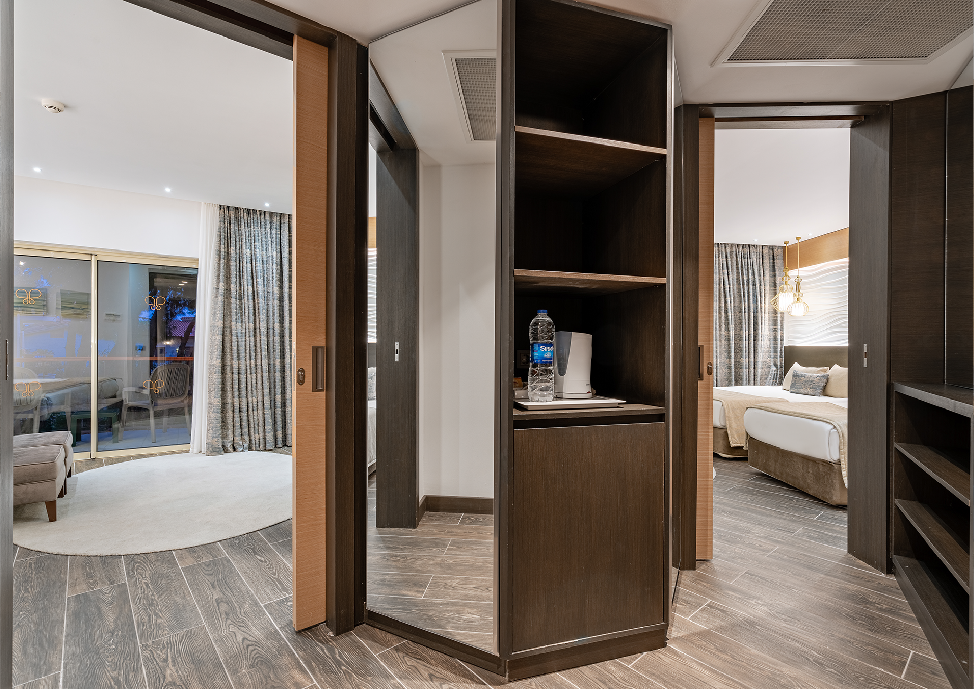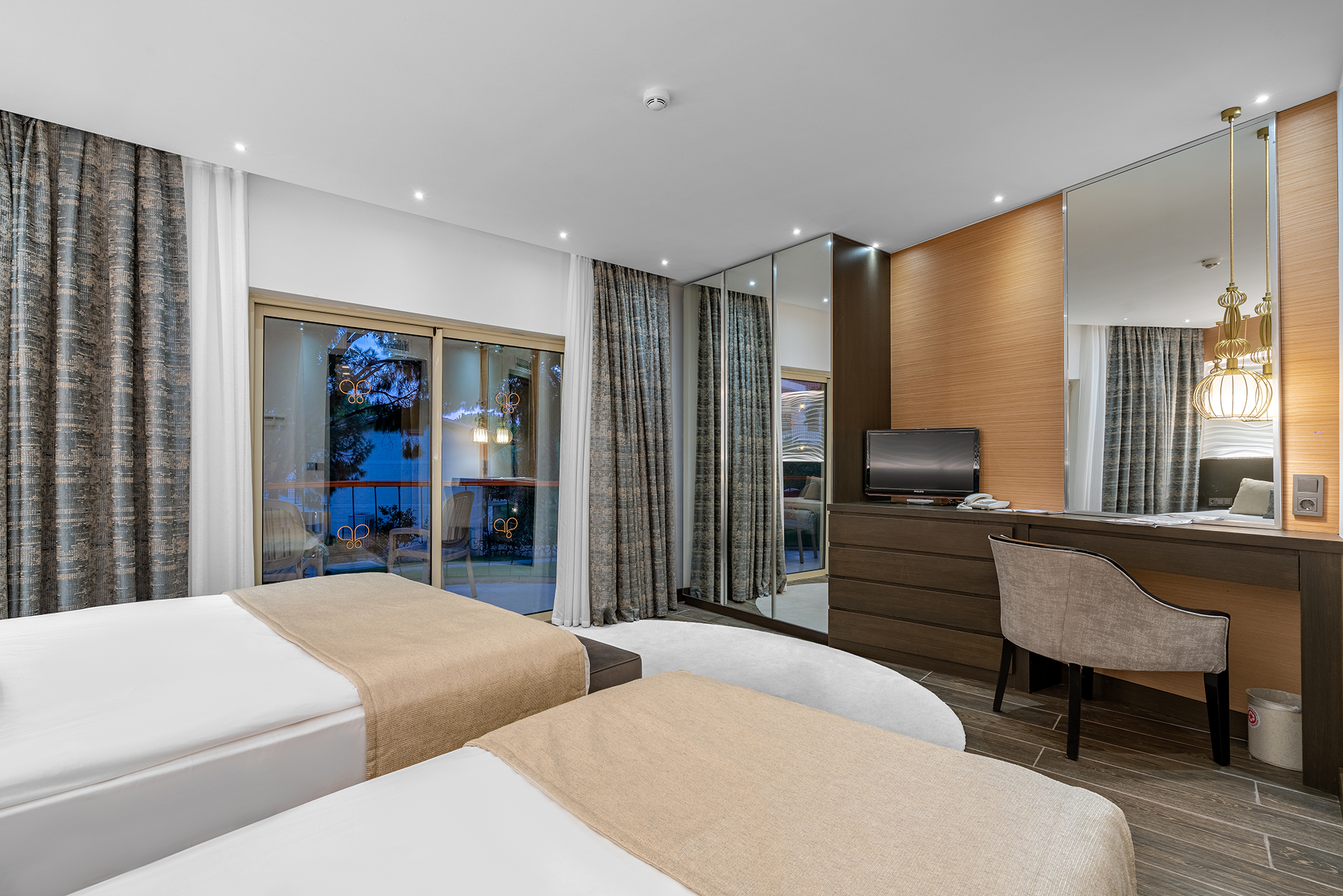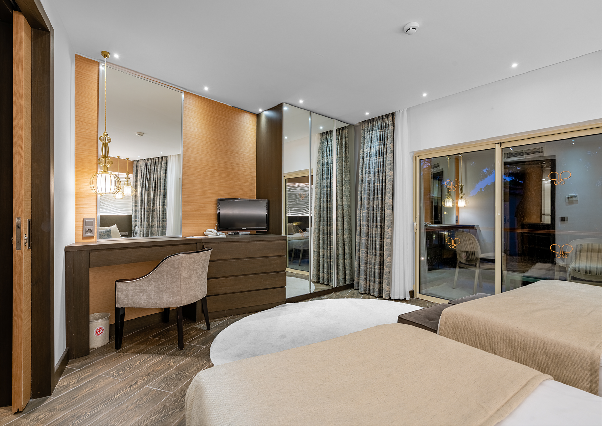 Comfort Club Family Room, geniş aileler için doğayla iç içe, sakin bir tatil kurgusu sunar. 50 m²’lik ferah bir alana yayılan ve iki ayrı yatak odasından oluşan bu yaşam alanı, altı kişiye kadar konaklama kapasitesiyle birliktelik ve mahremiyeti dengeli bir uyum içinde buluşturur.