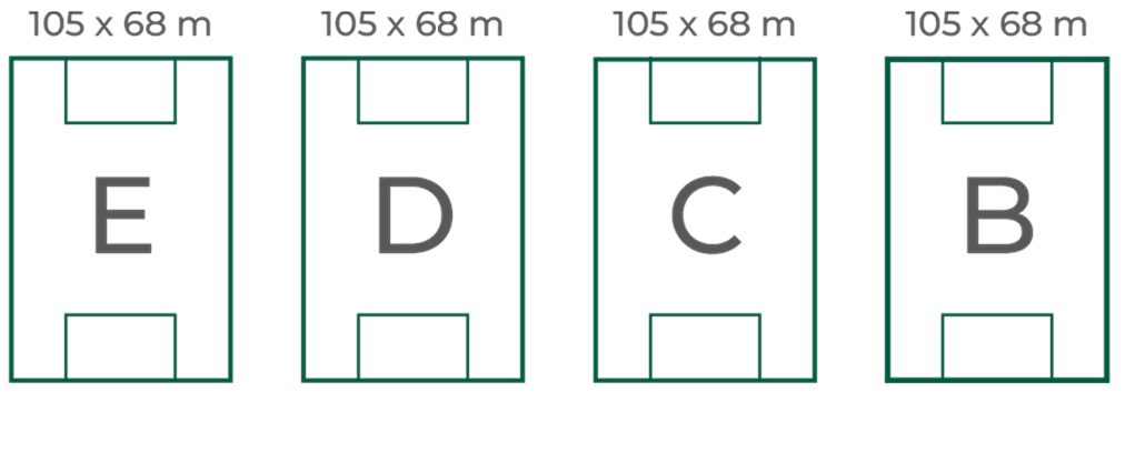 B, C, D ve E sahaları; FIFA ölçülerine uygun, tam boyutlu doğal çim futbol sahalarıdır. Güçlü aydınlatma altyapısı ve üstün drenaj sistemi sayesinde yoğun kamp ve antrenman programlarına kesintisiz şekilde hizmet verir. Profesyonel takımlar için eş zamanlı kullanım avantajı sunar.