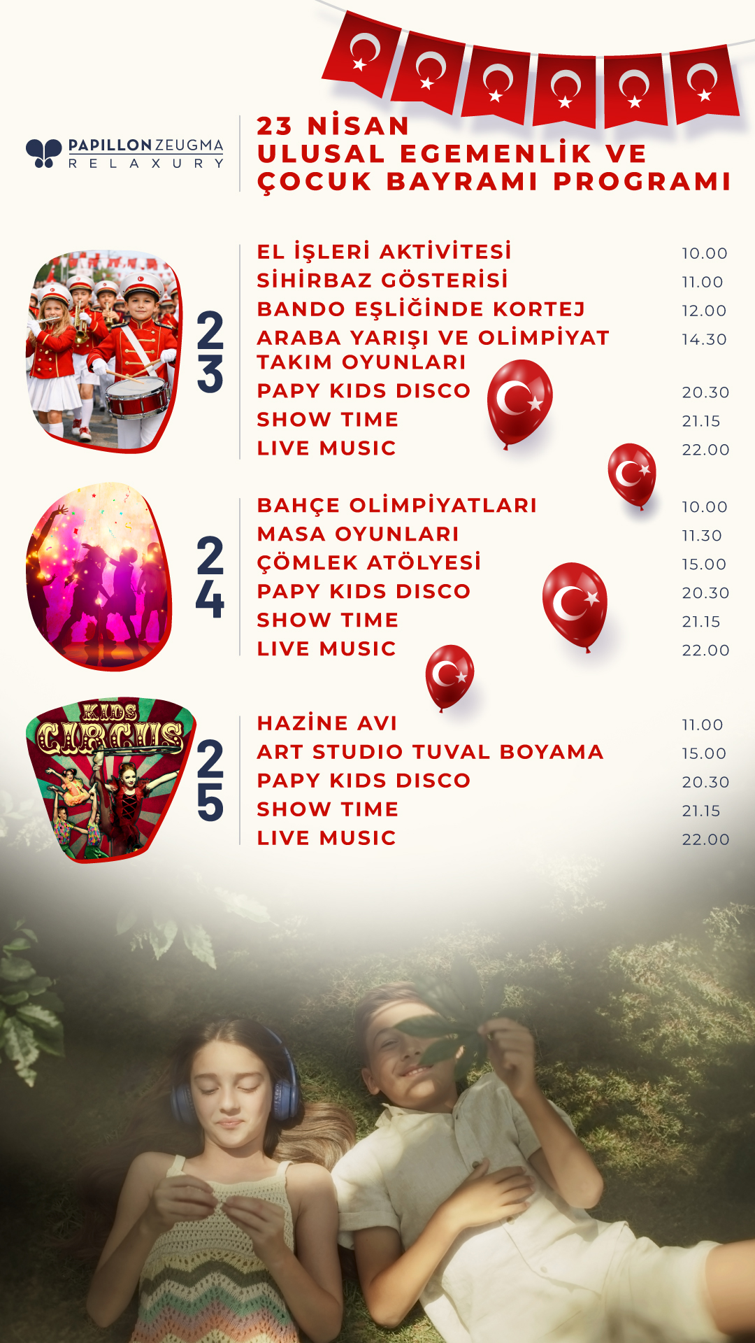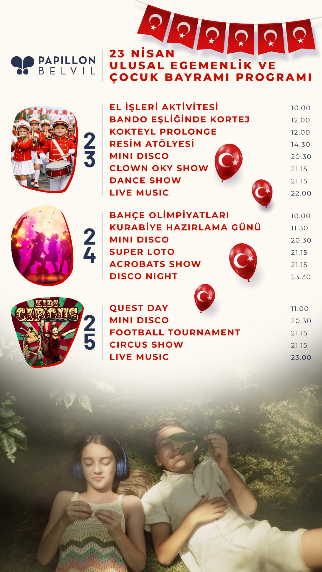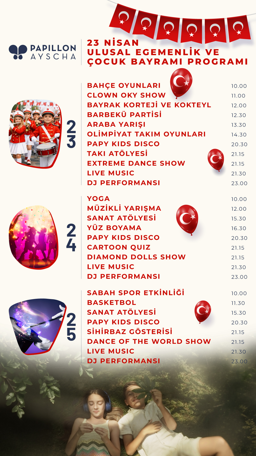 23 Nisan Ulusal Egemenlik ve Çocuk Bayramı’nın gururunu ve neşesini, Papillon Hotels’in ayrıcalıklı dünyasında festival tadında bir programla taçlandırıyoruz. Bando eşliğinde düzenlenen görkemli kortejlerden her yaşa hitap eden olimpiyat oyunlarına, yaratıcı atölyelerden profesyonel sahne şovları ve canlı müzik performanslarına kadar uzanan dopdolu etkinlik akışımızla, bayram ruhunu tüm aile birlikte yaşıyoruz. Siz de bu anlamlı günü Akdeniz’in huzurlu atmosferinde, eğlence ve konforla buluşan unutulmaz bir tatille kutlamak için özel tekliflerimizden yararlanarak rezervasyonunuzu hemen gerçekleştirebilirsiniz.